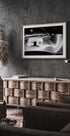 Este impressionante pôster em preto e branco mostra a frente de um carro de corrida antigo com o distintivo emblema "1c". As curvas elegantes, os reflexos polidos e os detalhes intemporais capturam a era de ouro do automobilismo e fazem dele uma sofisticada obra de arte para os entusiastas de carros clássicos.