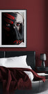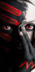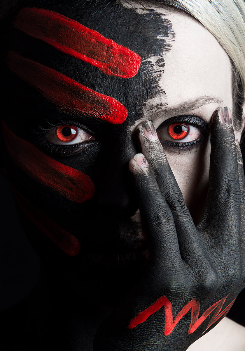 Este retrato intenso mostra uma mulher com impressionantes olhos vermelhos e pintura corporal dramática em tons de fogo. Traços pretos e vermelhos no rosto e nas mãos evocam o poder bruto do fogo e unem a fotografia figurativa à arte simbólica. Uma obra de arte ousada e cativante que irradia paixão, força e intensidade.