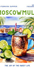 Este pôster animado mostra um refrescante Moscow Mule servido em uma caneca de cobre, acompanhado de limão fresco e uma piscina ao fundo. Com cores fortes e um clima de verão, captura a alegria dos cítricos, do frescor e do relaxamento - uma obra de arte perfeita para cozinhas, bares ou paredes de quadros inspiradas no verão.
