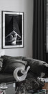 Denne plakat fanger A'DAM Tower i Amsterdam i et dramatisk sort/hvidt perspektiv, hvor facadens vinduer, blændinger og dybe skygger danner en grafisk rytme. De skarpe linjer og reflekser leder blikket opad og giver en stærk, urban stemning. Fotografi af Roland Weber. En hyldest til modernistisk arkitektur og byens pulserende energi ved IJ.