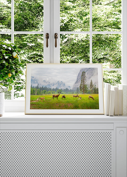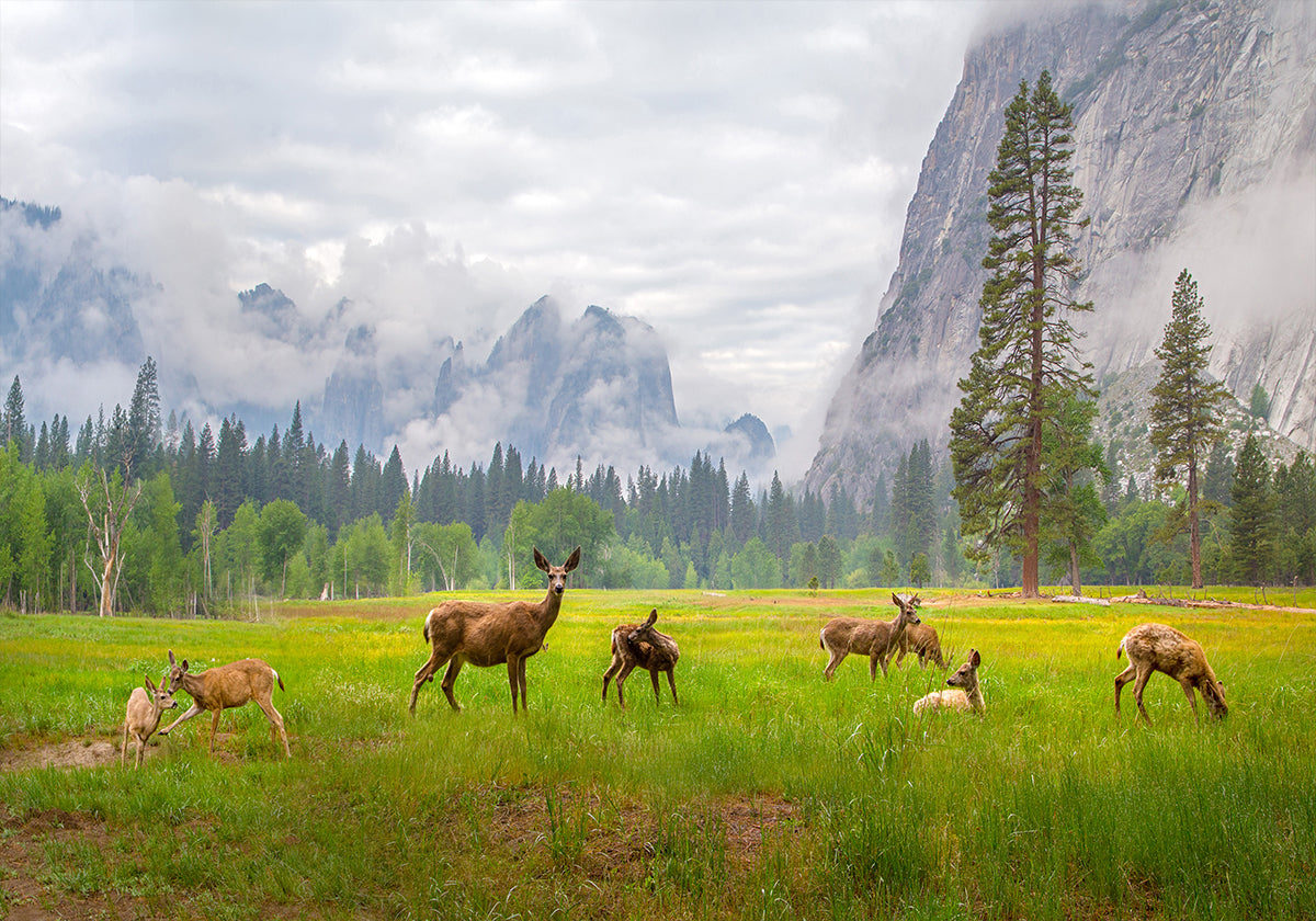 Os cervos vagam por uma campina enevoada de Yosemite, os chifres captando o primeiro ouro do amanhecer enquanto pinheiros imponentes e penhascos distantes se erguem como guardiões. Uma procissão silenciosa pela natureza, esta cena evocativa de Dianne Mao convida a uma pausa atemporal - onde o vale, a floresta e o rebanho respiram em harmonia antiga. Inspire o silêncio.