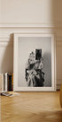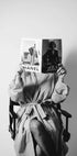 Uma sofisticada fotografia em preto e branco de uma mulher com um sobretudo e meia-calça de bolinhas segurando revistas de moda com Chanel e Elle. A obra de arte exala estilo atemporal e elegância parisiense, perfeita como peça de referência em interiores modernos e voltados para a moda.