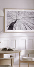 Esta evocativa obra de arte em preto e branco mostra a vista do chão da floresta, em direção a altos troncos de árvores e galhos finos desaparecendo na neblina. A composição mistura mistério, tranquilidade e geometria da natureza e cria uma obra atemporal que evoca o silêncio e a beleza serena da floresta.