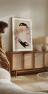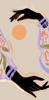 Uma ilustração figurativa moderna de duas mãos negras alcançando um sol laranja brilhante. Os braços são adornados com mangas florais em tons pastéis suaves, criando uma mistura poética de beleza botânica e minimalismo abstrato. A obra simboliza harmonia, energia e conexão com a natureza.