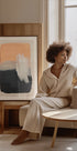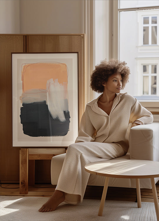 Um pôster abstrato moderno com pinceladas ousadas em pêssego quente, cinza em camadas, preto profundo e um toque de branco suave. Os traços texturizados e os tons contrastantes criam uma composição impressionante que equilibra calor e profundidade – perfeita para interiores minimalistas, decoração escandinava ou elegantes paredes de galerias.