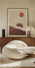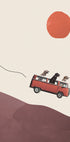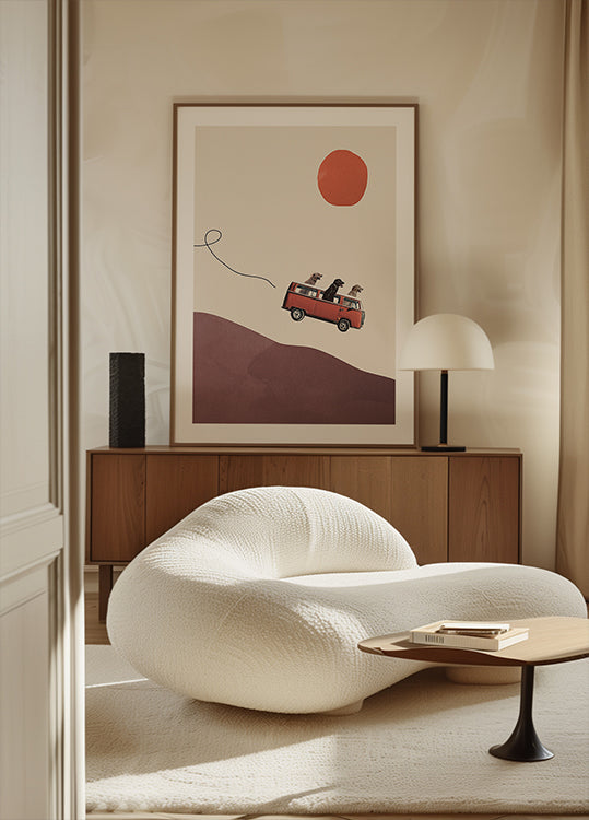 Um pôster divertido e bem-humorado com cães dirigindo um ônibus VW vermelho sobre colinas sob um sol forte. Com seu estilo peculiar de colagem, vibração retrô e expressões divertidas, a obra de arte captura o espírito de liberdade, aventura e amizade.