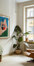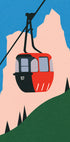 Uma ilustração gráfica ousada e divertida de um teleférico vermelho deslizando pelos Alpes. Com linhas limpas, cores planas e uma estética retrô de viagem, a obra captura a alegria da aventura nas montanhas e o charme atemporal do transporte nas altas montanhas em um estilo moderno e artístico.