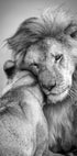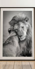 Um comovente pôster em preto e branco da vida selvagem mostrando um leão e uma leoa em um abraço terno. Capturada no Serengeti da Tanzânia, esta obra de arte simboliza o amor, a força e a devoção na natureza. Perfeito para interiores natureza, animais e românticos.