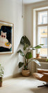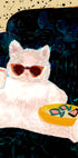 Um gato branco e confiante com óculos de sol posa em um colorido universo pop-art onde as vibrações retrô encontram a arrogância contemporânea. Humor, aconchego e um toque de petisco de frutos do mar tornam o motivo lúdico e charmoso. Pastéis claros e tons vintage elevam a parede. Ideia de presente perfeita. Um pôster peculiar da artista Uma Gokhale. Ideal para sala e escritório.