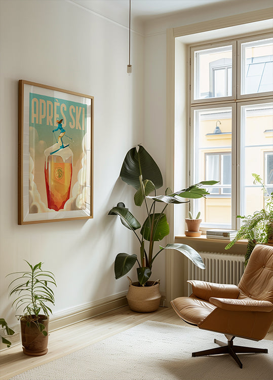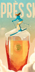 Um divertido pôster pós-esqui retratando um esquiador caindo em um copo de cerveja espumoso, uma mistura de aventura alpina e celebração pós-esqui. Com cores fortes e ilustrações bem-humoradas, a obra capta a alegria dos esportes de inverno, das bebidas festivas e da atmosfera animada das férias na montanha.