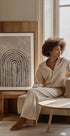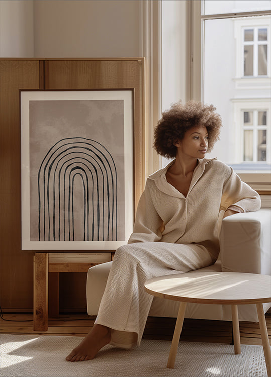 Motivo gráfico e minimalista com arcos pretos subindo em camadas rítmicas sobre um fundo bege quente. A simetria clara e o contraste entre claro e escuro criam calma, profundidade e direção. Um ponto focal atemporal que confere equilíbrio à sala, hall de entrada ou home office. Adapta-se perfeitamente a quartos nórdicos, modernos e de inspiração japonesa.