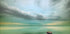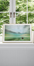 Uma cena pacífica com um barco solitário flutuando silenciosamente na água sob um céu nublado. Com tons suaves de verde e azul, este motivo de mar calmo evoca solidão, harmonia e reflexão tranquila.