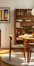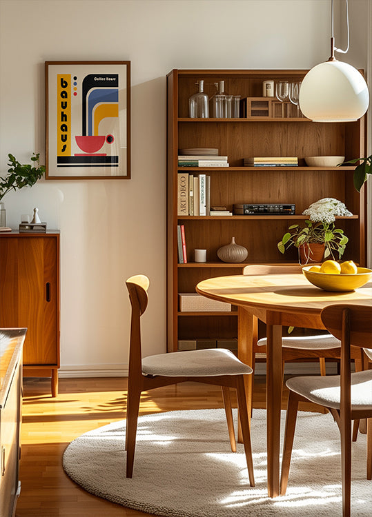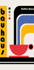 Um pôster de cafeteria inspirado na Bauhaus com formas geométricas ousadas em vermelho, amarelo, azul e preto. O design abstrato mostra uma xícara de café fumegante no puro estilo Bauhaus, que combina funcionalidade com simplicidade artística. Arte de parede perfeita para cozinhas retrô, cafés e amantes do modernismo vintage.