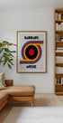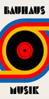 Um ousado pôster musical inspirado na Bauhaus apresentando um disco de vinil preto estilizado com linhas geométricas dinâmicas em vermelho, amarelo e azul. Esta obra de arte retro-moderna celebra a música, o ritmo e o design no espírito do minimalismo da Bauhaus. Arte de parede perfeita para amantes da música, colecionadores de discos e interiores modernos.