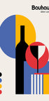 Um pôster moderno inspirado na Bauhaus apresentando uma garrafa de vinho e uma taça de vinho estilizada com formas geométricas ousadas em preto, vermelho, amarelo e azul. Este design abstrato combina a elegância do vinho com a estética atemporal da Bauhaus, perfeito para bares, cozinhas, salas de jantar e amantes do vinho.