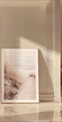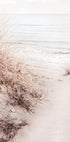 Uma fotografia costeira tranquila que captura dunas de areia com grama fina que levam até a costa tranquila. Os tons suaves de bege e a expressão luminosa criam um ambiente calmo e natural, ideal para uma decoração inspirada no litoral.