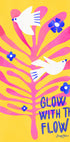 Um pôster feliz e motivacional com duas pombas brancas voando entre fortes folhas rosa e flores azuis em um fundo amarelo vibrante. A tipografia lúdica “Glow with the Flow” adiciona uma mensagem edificante de positividade e alegria. Perfeito para trazer boas vibrações para qualquer ambiente.