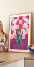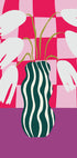 Uma natureza morta floral ousada e divertida com um toque retro-moderno. O vaso listrado e as flores brancas abstratas contrastam com um fundo xadrez rosa vibrante, proporcionando uma mistura feliz de cor, humor e design gráfico.