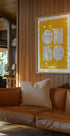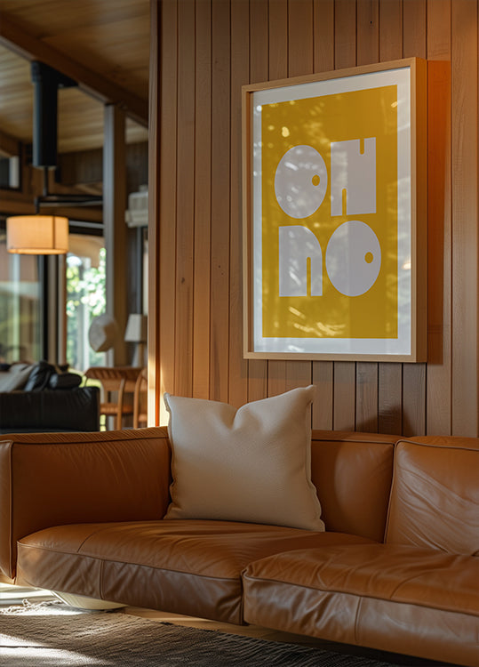 Uma obra de arte tipográfica distintamente minimalista que soletra "oh não" com formas geométricas ousadas em um design de inspiração retrô. Com um fundo amarelo vibrante e formas circulares suaves, o pôster combina humor, diversão e estética gráfica moderna, tornando-o uma peça marcante de arte de parede contemporânea.