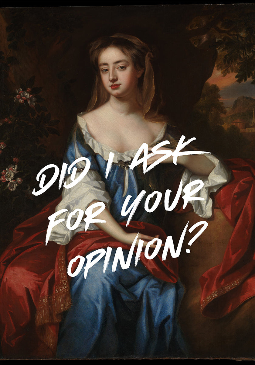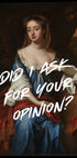 Este pôster humorístico combina um retrato barroco refinado com texto manuscrito em negrito: “Eu pedi sua opinião?”. A interação entre elegância vintage e sátira moderna cria uma declaração bem-humorada e rebelde, perfeita para adicionar personalidade e toque especial a qualquer parede.