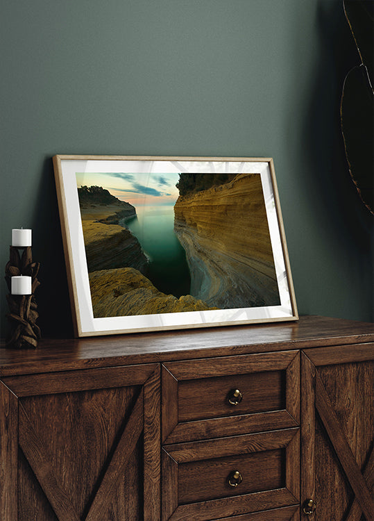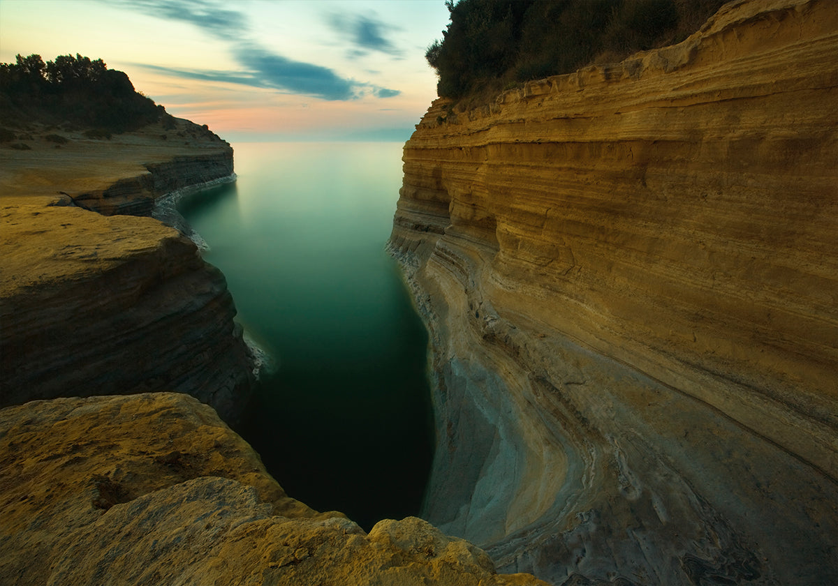 Uma foto serena de longa exposição do icônico Canal d'Amour em Corfu, Grécia. As águas esmeraldas são emolduradas por dramáticas falésias de arenito, criando uma atmosfera misteriosa e romântica. Esta paisagem costeira capta a beleza natural, a tranquilidade intemporal e o encanto lendário do Mar Jónico.