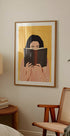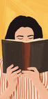Uma ilustração calorosa e convidativa de uma mulher profundamente absorta em um livro, contra um rico fundo amarelo. A camisa listrada e os tons terrosos acrescentam um charme aconchegante e moderno — perfeita para recantos de leitura, bibliotecas ou qualquer espaço que celebre a alegria dos livros.