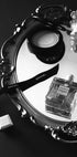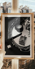 Uma elegante fotografia em preto e branco dos produtos de beleza Chanel, apresentando o icônico perfume Gabrielle Chanel, fita elegante e detalhes refinados em um espelho vintage. Esta estampa expressa o luxo e a sofisticação franceses atemporais e se torna uma declaração elegante em interiores inspirados na moda, beleza e elegância clássica.