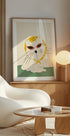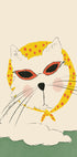Uma ilustração caprichosa em estilo retro de um gato usando óculos escuros inteligentes e um lenço amarelo de bolinhas. Com linhas divertidas e um toque nostálgico de meados do século, esta peça combina humor e charme e é uma declaração alegre para os amantes de gatos e interiores de inspiração retro.
