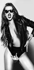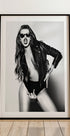 Um retrato ousado e ousado em preto e branco de uma mulher com uma jaqueta de couro e óculos escuros que exala confiança e atitude. Combinando sensualidade, rebelião e glamour, esta impressionante obra de arte inspirada na moda é perfeita para interiores modernos, áreas de moda ou como uma declaração de arte contemporânea de parede.