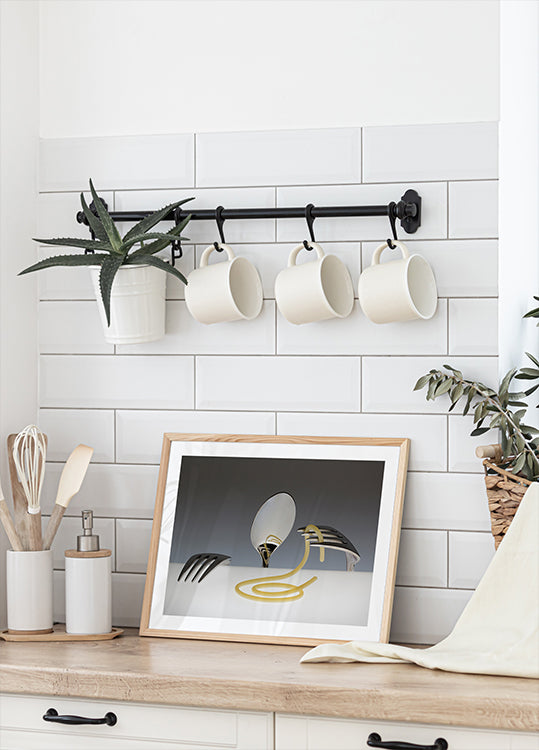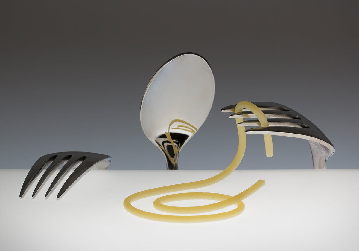 Uma natureza morta lúdica onde garfos, uma colher e um fio de espaguete criam uma composição humorística. Os talheres são dispostos como figuras, enquanto a massa funciona como cabelos soltos. Esta espirituosa obra de arte mistura comida e fantasia, transformando uma refeição cotidiana em um retrato artístico surreal.