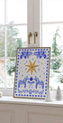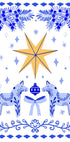 Um pôster de inverno atmosférico de inspiração folclórica de Aliya Putrus: uma estrela dourada no centro cercada por flocos de neve, frutas vermelhas e um laço decorativo, com um pequeno cavalo dala como detalhe encantador. Tons de azul, branco e marrom criam uma atmosfera natalina escandinava, calorosa e nostálgica. Perfeito para hall de entrada, sala de estar ou quarto de criança durante a época festiva.