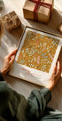 Um elegante poster de Natal tipográfico em tons de bronze, onde o texto "Feliz Natal" está escrito numa caligrafia elegante sobre um fundo castanho quente. A expressão minimalista e a paleta de cores calmas criam um ambiente acolhedor e moderno, perfeito para as férias de inverno e uma expressão requintada e sazonal em casa.