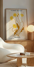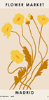 En farverig, grafisk plakat, hvor frodige blomster folder sig ud i harmoniske former omkring den markante typografi 'Flower Market – Madrid'. Udtrykket fanger følelsen af et livligt marked: duft af friske buketter, varme toner og en legende balance mellem tekst og motiv, perfekt til at give rummet energi.