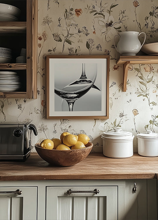 Pôster minimalista e monocromático, onde duas taças de vinho formam pura geometria: uma em pé e outra de cabeça para baixo. As silhuetas curvas se espelham em luz brilhante e sombras suaves, enquanto o espaço negativo cria calma e equilíbrio. Uma natureza morta elegante, perfeita para a cozinha, carrinho de bar ou sala de jantar. Sutil e sofisticado, com um drama tranquilo.