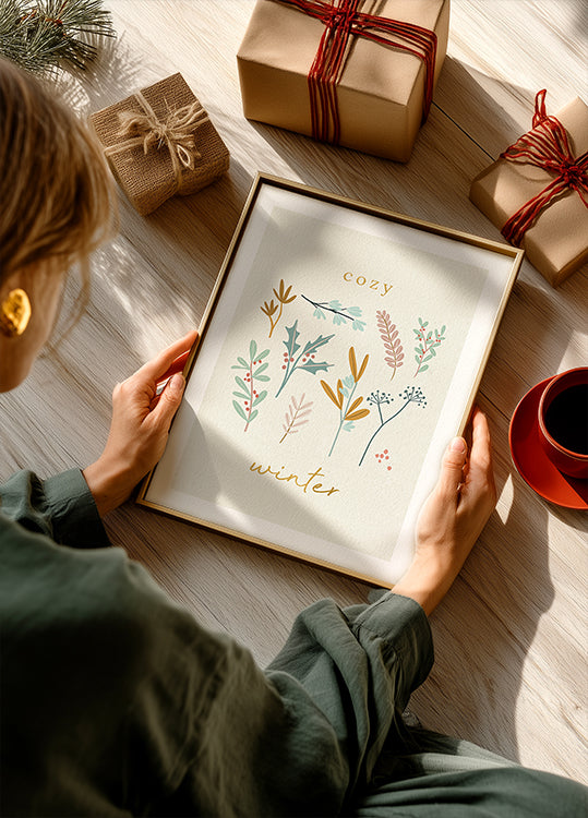 Ramos botânicos de inverno e flores em tons pastéis suaves encontram finos detalhes dourados e tipografia manuscrita que sussurra Cosy Winter. Detalhes foscos e flocos de neve claros proporcionam paz e calor ao mesmo tempo, perfeitos para o Natal e as noites escuras. Um elegante pôster sazonal de Goed Blauw. Perfeito para hall de entrada, sala e quarto de criança.