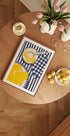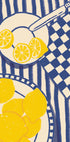 Esta ilustração alegre captura o charme animado de uma mesa de verão mediterrânea. Limões fatiados em um prato branco, um guardanapo xadrez e uma pilha de limões inteiros repousam sobre uma toalha de mesa com listras azuis - e criam uma atmosfera fresca e feliz na cozinha. O estilo estilizado e desenhado à mão acrescenta um toque artístico, enquanto a paleta de cores amarelo e azul evoca memórias da vida costeira e das manhãs ensolaradas. Perfeito para trazer energia e elegância cítrica para sua cozinha, sala de jantar ou parede de galeria.