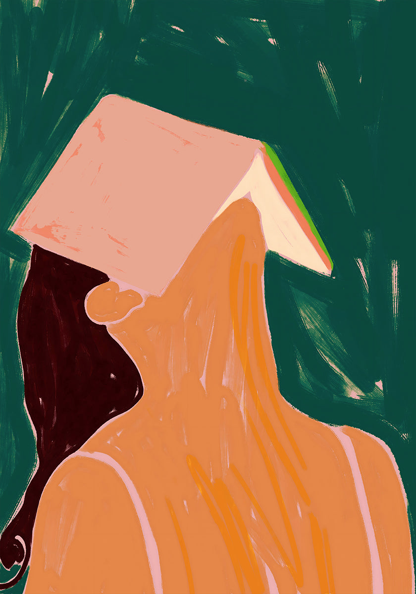 Reading Between the Lines de Uma Gokhale captura um momento tranquilo de contemplação: uma mulher em repouso, absorta em seu livro, cercada por tons pastéis suaves e pinceladas sutis. Luz e sombra sugerem reflexão, enquanto a composição convida à proximidade, à tranquilidade e à magia tranquila da leitura. Um retrato moderno e poético da alegria da leitura e da autorreflexão tranquila.
