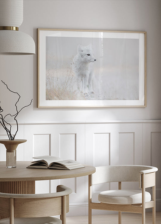 En nysgerrig arktisk ræv standser i det høje, hvide lys og kaster et vågent blik mod horisonten. Roelof de Hoog indfanger vinterens stille poesi i et højlyst, minimalistisk øjeblik, hvor sneens fine strukturer og rævens bløde pels tegner en rolig, tidløs stemning. Den lyse, næsten monokrome palet fremhæver dyrets ynde og eventyrlige nærvær.