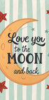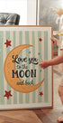 En poetisk plakat med det elskede citat "Love you to the moon and back" i elegant typografi, omgivet af en glødende måne, spredte stjerner og dybe nattehimlens nuancer. Motivet udstråler ro, varme og kosmisk charme og indfanger følelsen af grænseløs kærlighed i et enkelt, moderne udtryk. Perfekt til rolige hjørner, soveværelser og børneværelser.