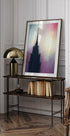 Manhattan Abstract Empire State Building af Janel Bragg indfanger New Yorks ikoniske skyline i et drømmende, impressionistisk udtryk. Den gyldne og rosa dis lader Empire State Building træde frem som en elegant silhuet blandt skyer og skyskrabere – en poetisk hyldest i morgentåge og bløde pasteller – NYC.