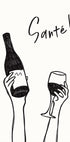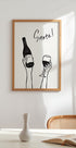 Mãos segurando uma garrafa de vinho e uma taça de vinho com o texto "Cheers!" em pôster francês