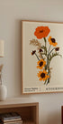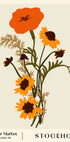 Um pôster minimalista de flores de Estocolmo com fortes flores laranja e amarelas em linhas gráficas limpas. Esta obra de arte de inspiração escandinava captura a simplicidade e a beleza natural, perfeita para interiores modernos.