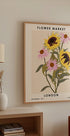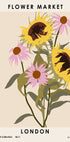 Um encantador poster floral com girassóis dourados e flores rosa suaves. Esta obra de arte moderna e de inspiração vintage celebra o esplendor floral de Londres e a atmosfera animada do verão.