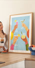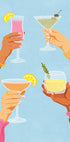 Uma ilustração viva e colorida que celebra a amizade e a alegria. Quatro mãos levantam suas taças de coquetel em uma tigela alegre contra um fundo azul brilhante, cheio de calor, positividade e comunidade - perfeito para cozinhas modernas, bares ou salas de estar.