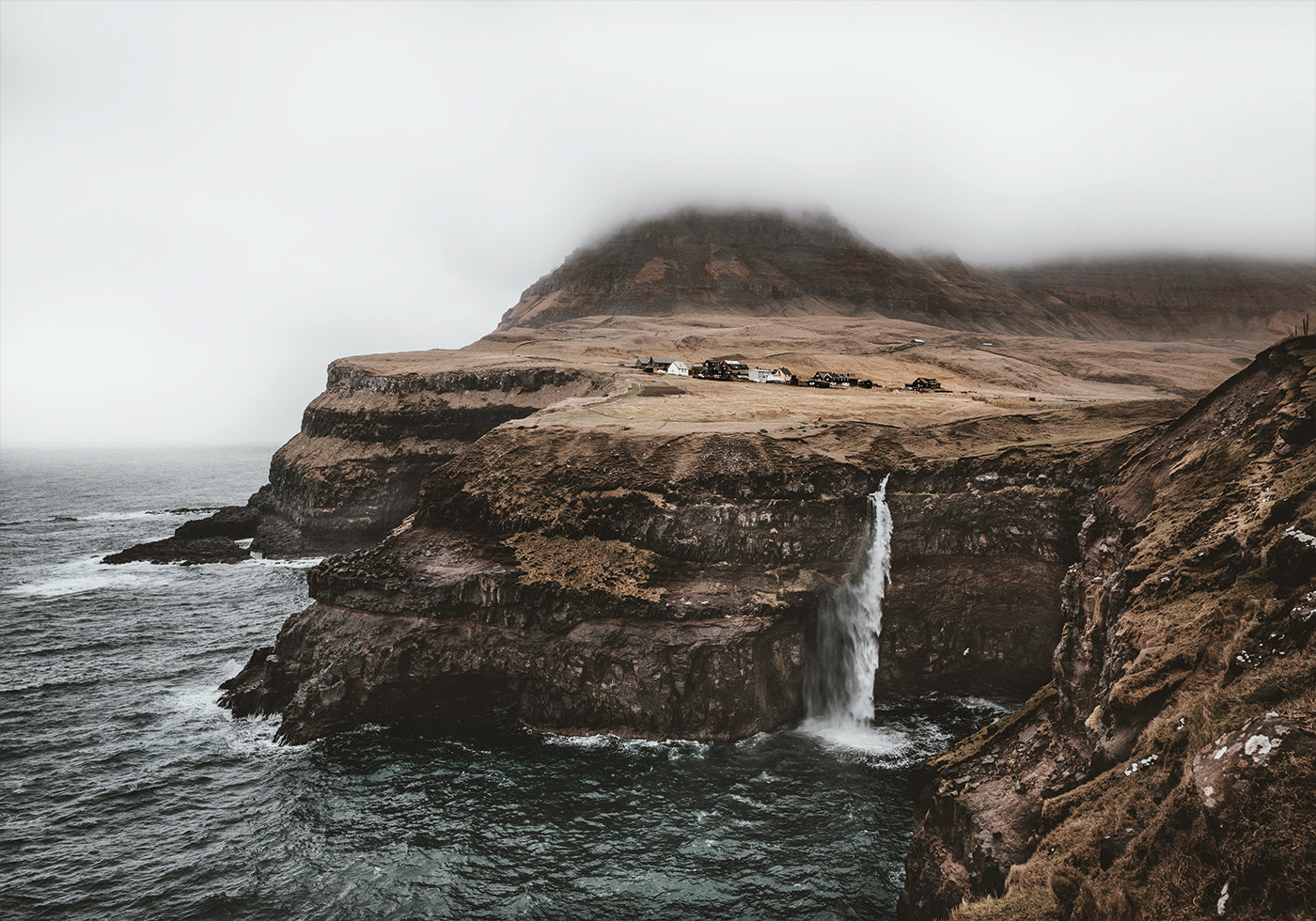 A icônica cachoeira Múlafossur desce graciosamente para o Oceano Atlântico, cercada por penhascos imponentes e uma vila charmosa em um planalto varrido pelo vento nas Ilhas Faroé. Nuvens baixas cobrem as montanhas, aumentando a beleza evocativa deste local remoto.