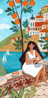 Mulher-poster de viagens na costa do Mediterrâneo