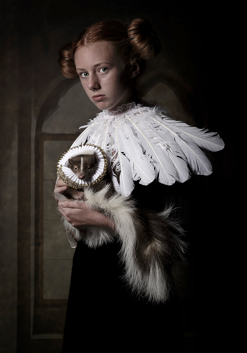 Da artista holandesa Carola Kayen-Mouthaan, este retrato evocativo mostra uma jovem composta em um vestido vintage com tons medievais, cabelo trançado e colarinho de penas, compartilhando a moldura com um gentil gambá. A iluminação dramática e nostálgica e as texturas refinadas conferem a elegância do velho mundo com um toque lúdico de conto de fadas, com ecos do retrato renascentista.
