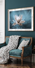 Esta elegante fotografia macro captura uma flor delicada em tons suaves de branco e azul, destacando as veias das pétalas e as gotas de orvalho brilhantes. O clima sonhador e os close-ups detalhados criam uma obra de arte sofisticada e relaxante, perfeita para uma parede moderna de quadros botânicos.
