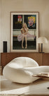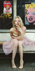 Uma interpretação moderna da pop art clássica, misturando motivos icônicos com estilo contemporâneo. Uma mulher com uma saia rosa reflete o glamour vintage em um cenário de grafite de Marilyn, de Warhol, e lata de sopa de Campbell, criando uma fusão visual dinâmica.