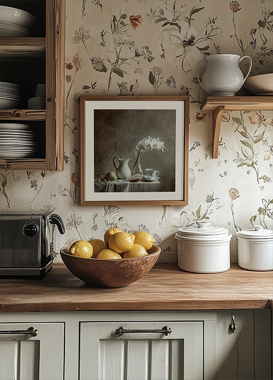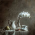 Parede antiga de Margareth Perfoncio captura uma natureza morta diante de uma parede desgastada e caiada: uma mesa posta com toalha macia, xícaras delicadas, copos e um vaso brilhante com orquídea e pêra. Tons suaves e naturais e uma luz suave e inclinada criam calma, poesia e elegância atemporal para a cozinha, sala de estar e sala de jantar. Perfeito para um ambiente calmo e nórdico.